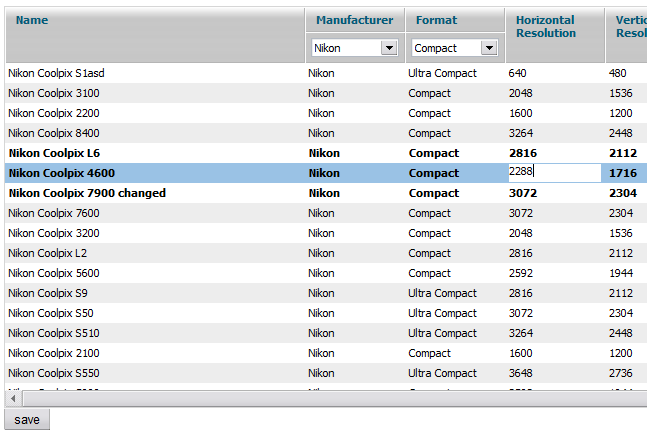 }You can see the result here. Edited lines still remain visually different when the page is reloaded, thus it's easy to notice the changes. Full page reloading and data store clearing take place while the page is being saved. Everything works from the technical point of view. As the last step we can add some free useful things such as sorting and filtering. Both the possibilities are standard for grid and don't require any voodoo programming.